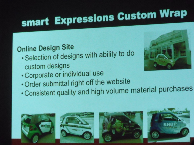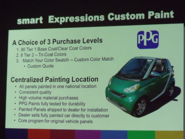 Entre las novedades mas interesantes esta la posibilidad de aquirir el Fortwo en el color del gusto del cliente, cualquier color literalmente, ya no se esta limitado a 6 opciones, esto es posible mediante un programa en el cual a la hora de ordenar el carro, se elige la opcion de elegir el color de su preferecia, incluso puede igualar cualquier tono que el cliente quiera, SmartUSA, pide los paneles a cierta compania quien los pinta y manda a la agencia donde el dueno recogera el carro, asi a la hora de la entrega el carro, este estara del color que lo pidio el dueno, lo mejor de esto, es que quienes ya tienen un Fortwo y quieren cambiarle el color, pueden usar este mismo programa, eligen, piden y pagan por el cambio de color, recibiran paneles nuevos y sus actuales se tomaran a credito. Otra novedad, es que ya se dieron cuenta que los Fortwos son una excelente fuente de publicidad movil, asi pues, quienes quieran promocionar su negocio o quieran personalizar su auto con graficos unicos pueden hacerlo tambien directamente mediante la red de concesionarios, asi nuevos duenos recogeran sus autos con la publicidad impresa en el carro desde la agencia, y los duenos existentes pueden hacerlo sin la preocupacion de invalidacion de garantias o ese tipo de cosas por acudir a terceros. Aclaro que estas 2 cosas, la elegida de cualquier color y la envoltura de los paneles en vinil tiene un costo extra.