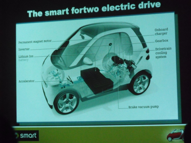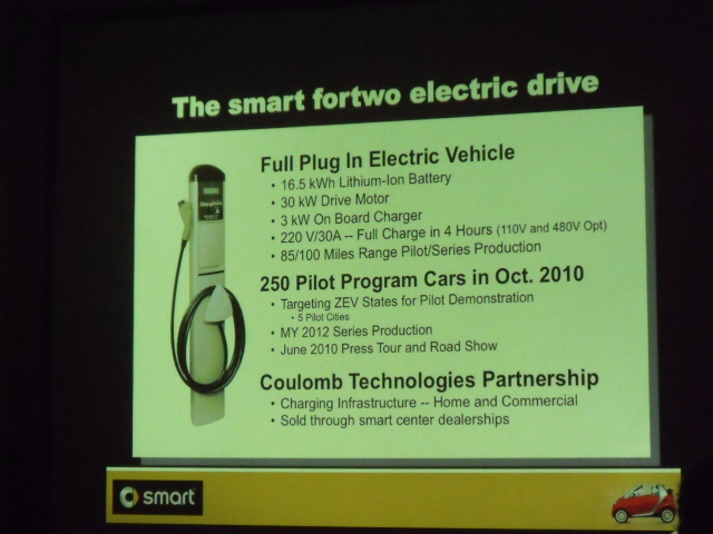 Otro de los principales atractivos estaba en el hotel, el nuevo Smart Fortwo ED (Electric Drive), el cual estara en un programa piloto a partir de octubre de este ano con 250 carros en algunas ciudades, y a partir del 2012, cualquiera que quiera y pueda adquirirlo podra hacerlo.
