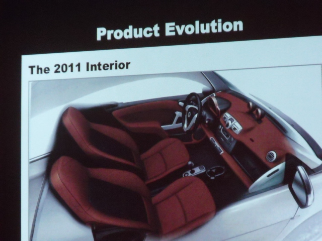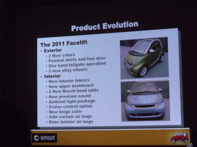 Y por ultimo, las novedades mas importantes, la gama Fortwo 2011, que estrenara 2 nuevos colores sin costo extra (verde y azul), nuevos rines y partes del mismo color que la carroceria como las partes de abajo de las puertas y las defensas, asi como el tapon de la gasolina. Ademas ahora la cajuela se podra abrir mas facilmente y el control de velocidad crucero sera una opcion. El cambio mas notable es el nuevo tablero, nuevo sistema de sonido, y bolsas de aire de cortina y en las rodillas.