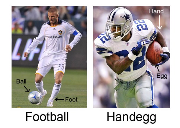 - Quieren ser unicos (por no llamarles de otra manera) al llamar «Soccer» al Football, y Football a un deporte que ellos inventaron y que principalmente se juega con las manos y no usa una pelota redonda si no una en forma de huevo.