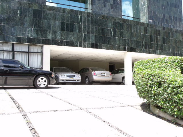 Aqui vemos un Charger negro con "tumbaburros" listo para seguir a su patron cuando este salga en su Mercedes Benz.