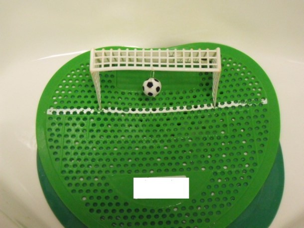 Respuesta: Efectivamente esta en el mingitorio, me imagino que su proposito es incrementar las posibilidades de «atinarle» al tratar de meter gol.