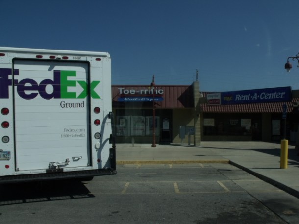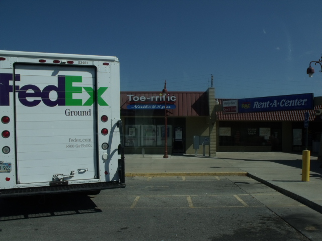 Camion de FedEx estorbando no 1 sino 2 lugares para discapacitados ya que en la otra esquina, enfrente del camion hay otro espacio con el mismo proposito, no importa que solo se estacione poco tiempo a hacer entregas, en cualquier momento se pueden necesitar esos lugares.