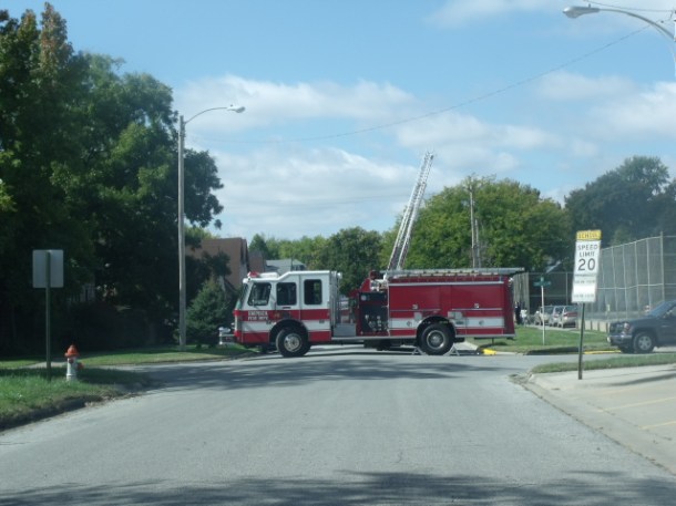 Camion de bomberos a media calle, tiene la escalera arriba, pero como ven no hay incendio y si un estacionamiento cercano para hacer demostraciones.