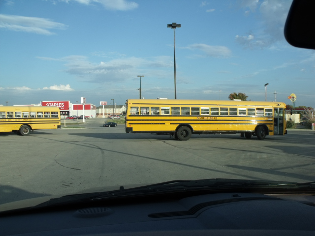 Autobuses escolares estorbando casi por mitad el paso a los demas autos, porque no estacionarse mas lejos y verticalmente.