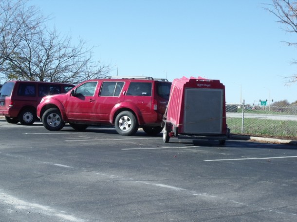 Si quieren ocupar mas de 1 lugar que se vayan a la parte trasera del estacionamiento. Esta Pathfinder y su remolque ocupando 3 espacios estaba afuera de la entrada de un hotel.