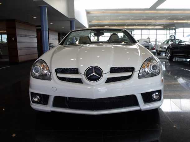 Para el 2011, el SLK estrena fascia delantera mas convencional con respecto al 2010 (la cual me parecia mas deportiva) parece que usaron las que les sobraron del SLK55 AMG, pero de forma mas normal.Y es que para el modelo 2011 la version AMG ha desaparecido aunque eso no significa el desperdicio de las partes ya que en este modelo son de serie accesorios que hasta el 2010 eran opcionales. Lo unico AMG que se puede poner en el SLK 2011 son los rines (como el modelo de la foto), pero debe optarse por el paquete deportivo, el modelo de las fotos tiene el paquete #1. Los faros delanteros se ven un poco grandes y para este 2011 estrena un acabado oscuro.