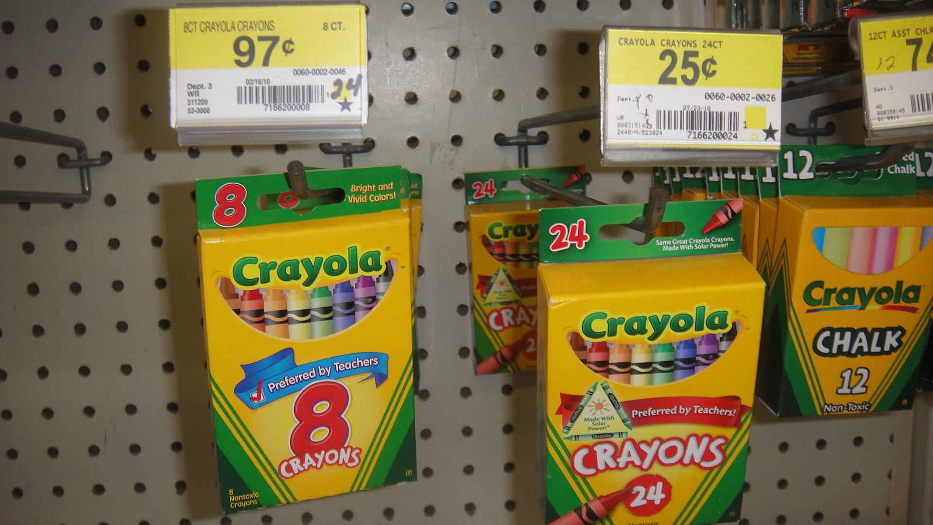 La logica y el sentido comun nos dicen que entre mas cosas se compran, se paga mas, es decir, casi siempre se paga menos por 1 litro de leche que por un galon de leche, entonces, que alguien me explique la siguiente situacion, donde un paquete de 8 crayones cuesta 97 centavos, y el paquete de 24 cuesta 25 centavos, como pueden ver ambos son de la misma marca, no estan mal acomodadas las cajas y no hay error en el precio.