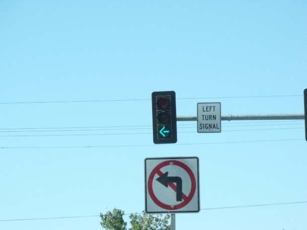 En el siguiente ejemplo vemos una senal de prohibido dar vuelta a la izquierda, y justo arriba vemos el semaforo indicando que la vuelta esta permitida, si no se puede dar vuelta temporalmente, porque no cubren la flecha del semaforo para evitar confusiones o mejor dicho, multas?