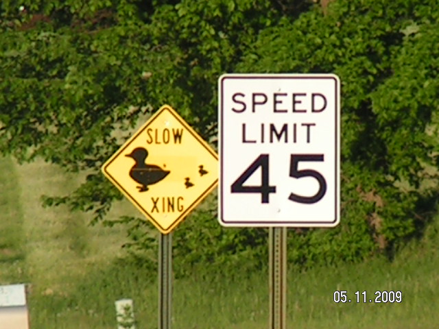 Primer caso, una senal anunciando que el limite de velocidad es de 45 mph y a los poco metros otra indicandonos que vayamos despacio porque es un cruce, de, aunque se oiga ridiculo, patos.