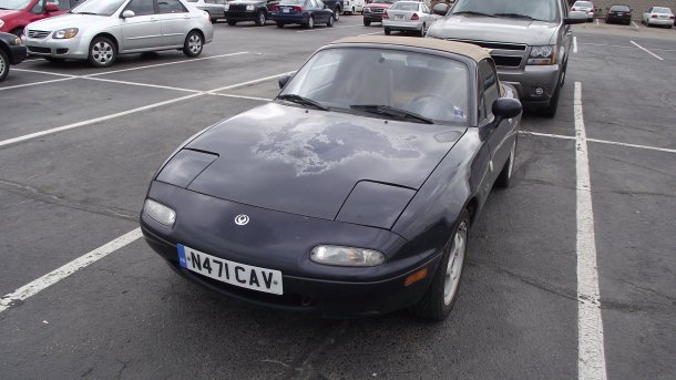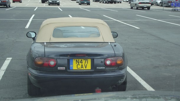 Respuesta: Preguntando a la dueña del Miata, me entere que los soldados que son mandados a bases militares en otros paises y se van a quedar cierto tiempo, pueden llevarse sus autos con los gastos de envio pagados cortesia de los ciudadanos (impuestos) alla deben de sacar placas locales para poder circular, cuando termina su exilio voluntario y regresan a casa, tienen 3o dias para sacar nuevamente placas gringas, mientras lo hacen, circulan con placas del lugar a donde los habian enviado.