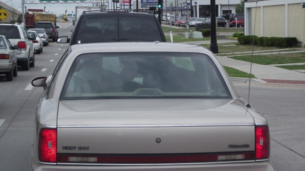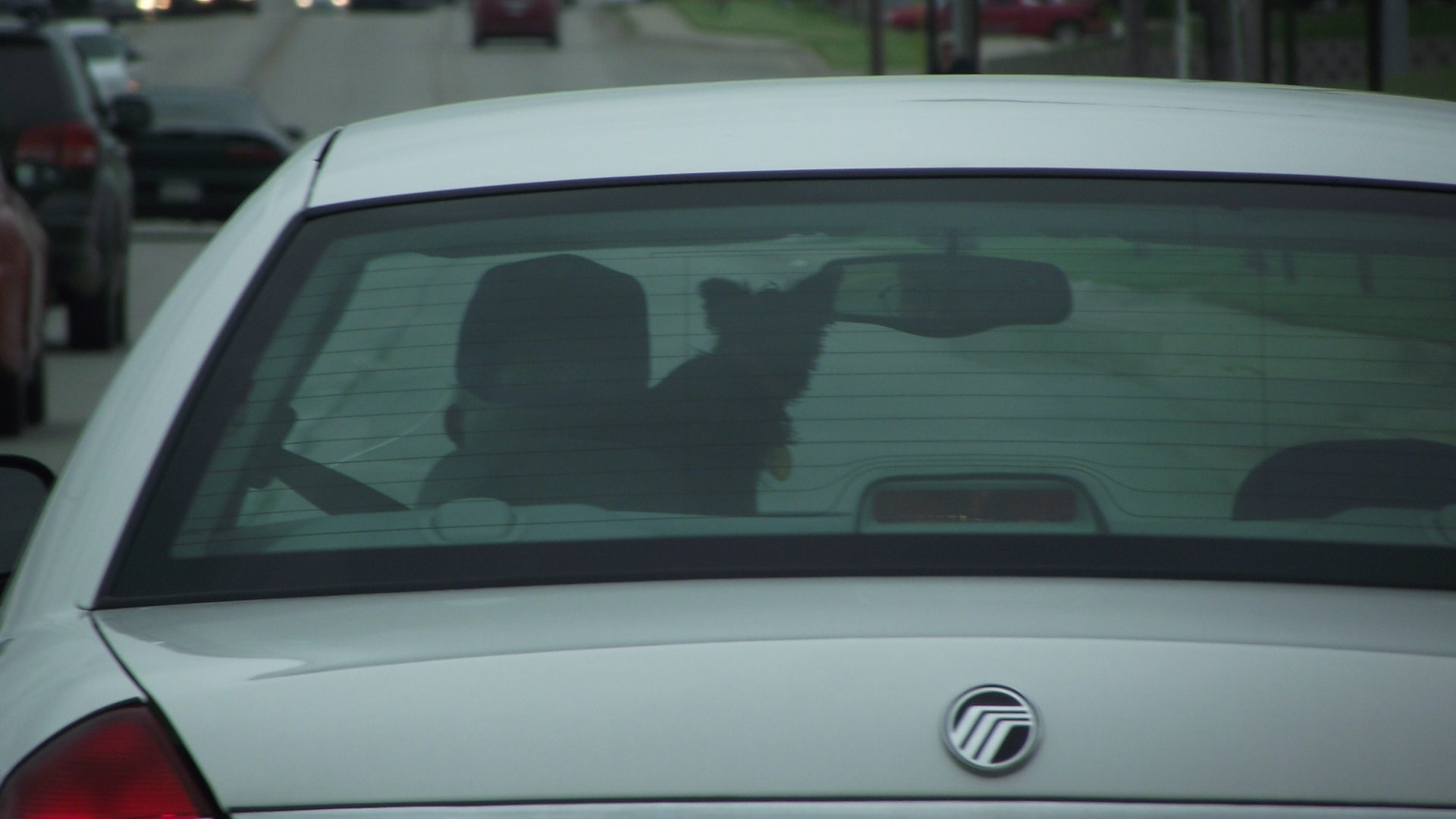 En este primer caso, vemos que el humano, no parece ir muy agusto en el asiento del conductor, lo mismo pasa con ese enorme perro que bien podria pasar por caballo, se nota que tiene que agachar la cabeza para estar sentado.