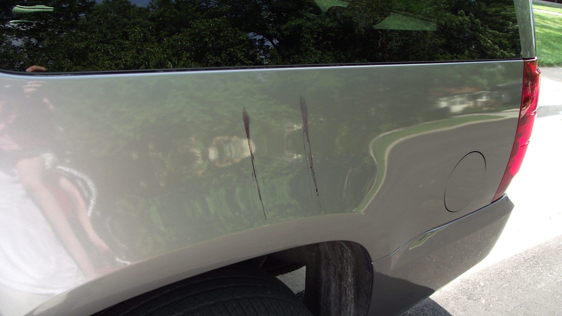 Actualizacion: Por fortuna resulto ser solo embarrada de paleta de hielo, al parece sabor uva, la simetria y paralelismo de los trazos me hacen dudar que haya sido un accidente, con un trapo humedo basto para quedar limpio, sin embargo, analizando cada centimetro de la Vallena, vimos que en menos de 3 meses con nosotros ya tiene varios regalitos en su carroceria y no me sorprenderia que alguno lo haya recibido ayer.
