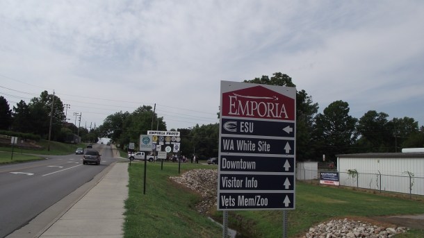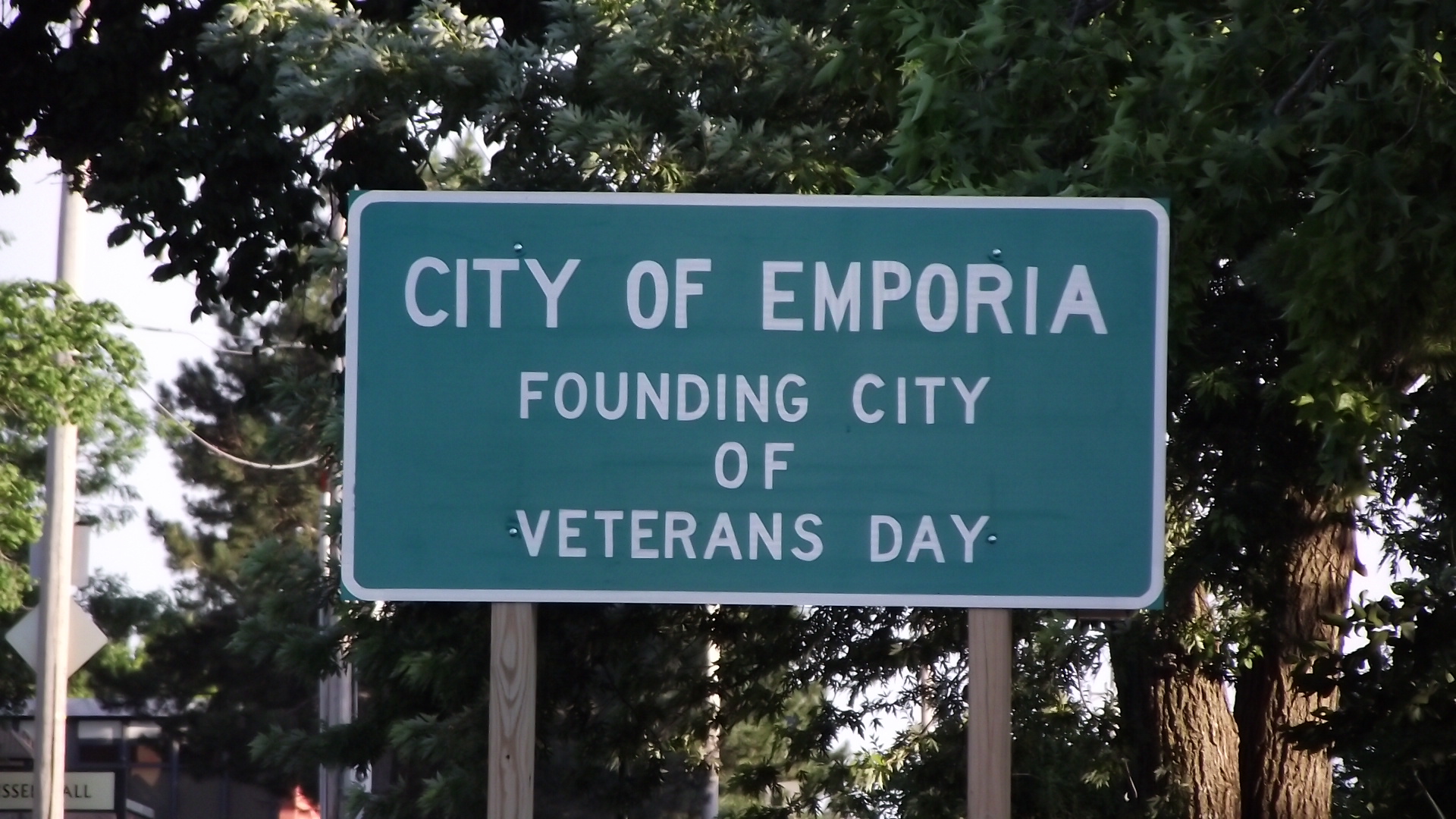 Para colmo, la primera piedra ni esta en la entrada de la ciudad, esta una cuadra despues, la gota que derrama el vaso es que en esa primera cuadra hay 3 letreros anunciando y dando la bienvenida a la ciudad, despues en la segunda cuadra tenemos la roca y justo al lado de ella otro letrero anunciando que Emporia es la ciudad fundadora del Dia de los Veteranos. Les dejo las imagenes de esta exageracion de letreros: