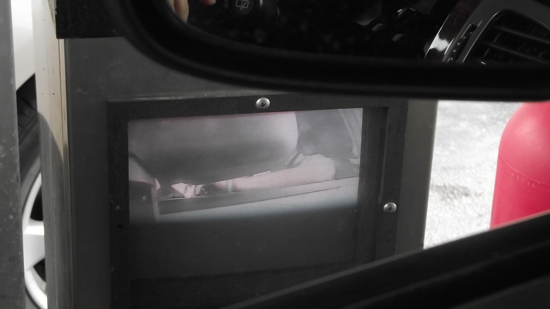 Como se ve en la foto, en la pantalla solo se ve el espejo lateral y mi brazo, pero mi cara esta totalmente oculta. Claramente la camara no hace su trabajo al 100%.