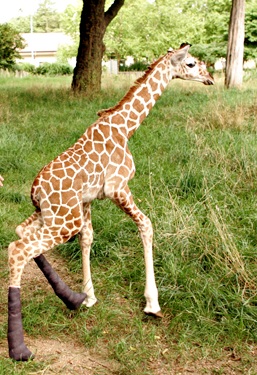 Contrario al minino, la jirafa es real, de carne y hueso. En Topeka, la capital de Kansas, nacio hace ya mas de un año una jirafa con deformidades en las patas traseras, los veterinarios decidieron darle una segunda oportunidad e implementaron tratamientos poco comunes en animales, incluyendo el uso de protesis para ayudar a los tendones a ponerse en su posicion natural.