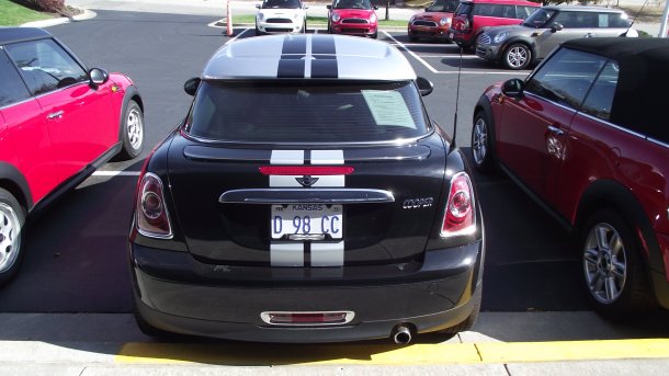 Viendolo por atras sabemos inmediatamente que estamos frente al nuevo integrante de la familia, este modelo no es hatchback o liftbabk o como quieran llamarle, es un coupe y por lo tanto tiene una diminuta pero muy notable cajuela. Sin embargo, el porton trasero se sigue abriendo como un hatchback. Tambien atras se ve un aleron desplegable inexistente en los otros MINI.