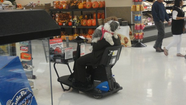 Ya les he comentado que los gringos son amantes de las mascotas, hacen articulos como carriolas, sillas para auto y otras cosas teniendo en cuenta a los amigos de 4 patas de los humanos, hay sin embargo, quienes dan un paso mas y sacan a sus mascotas de compras, a esto me refiero: