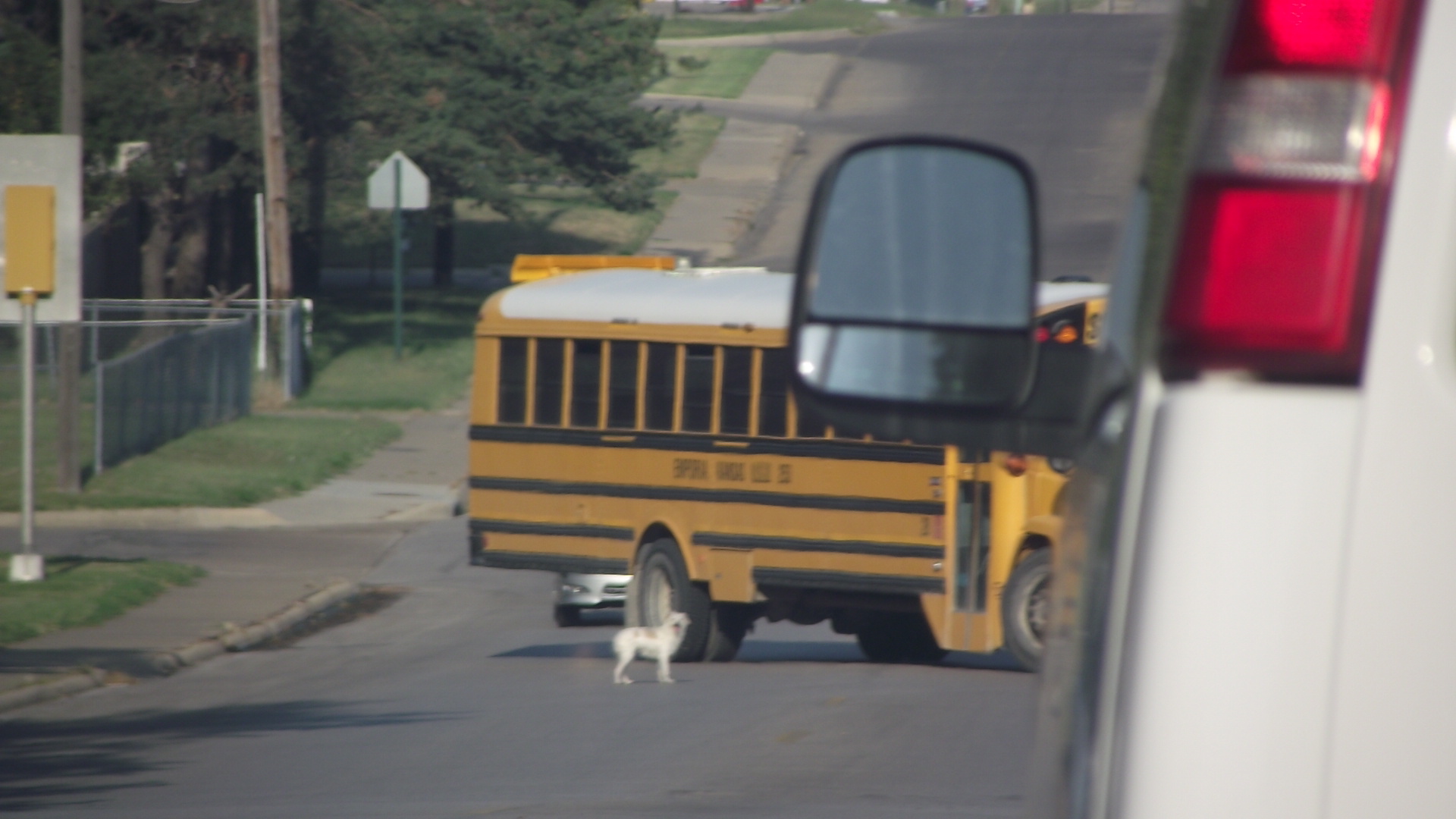 Otro perro con personalidad suicida, ni siquiera voltea hacia el lado de donde vienen los autos, tuvo suerte que el camion escolar dio vuelta.