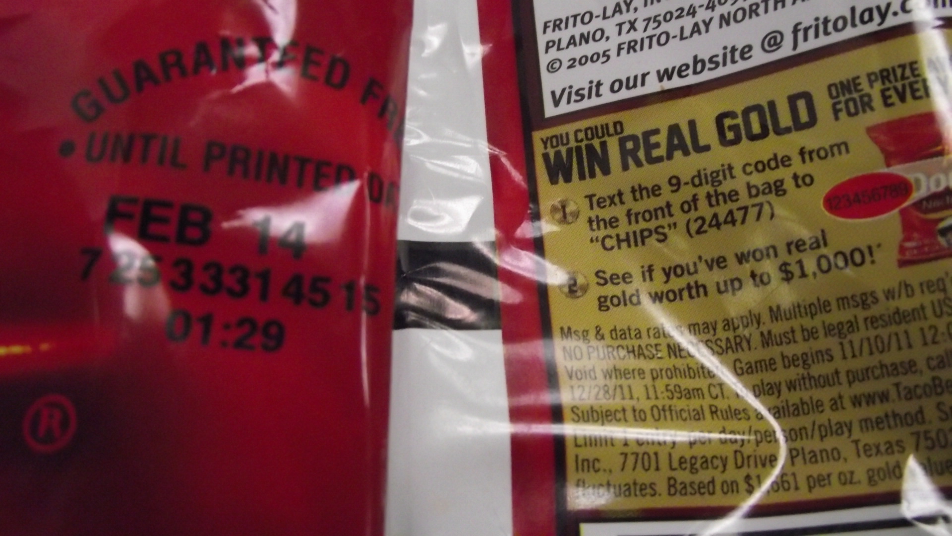 La promocion de Doritos consiste en «textear» el codigo de 9 digitos del frente de la bolsa a cierto numero (parte amarilla de la derecha) para ver si ganaste «Oro real», el problema es que como vemos en la parte izquierda, el codigo tiene 11 digitos, por si fuera poco, ese dia consumimos 4 bolsas de Doritos y absolutamente todas tenian el mismo codigo de 11 digitos: