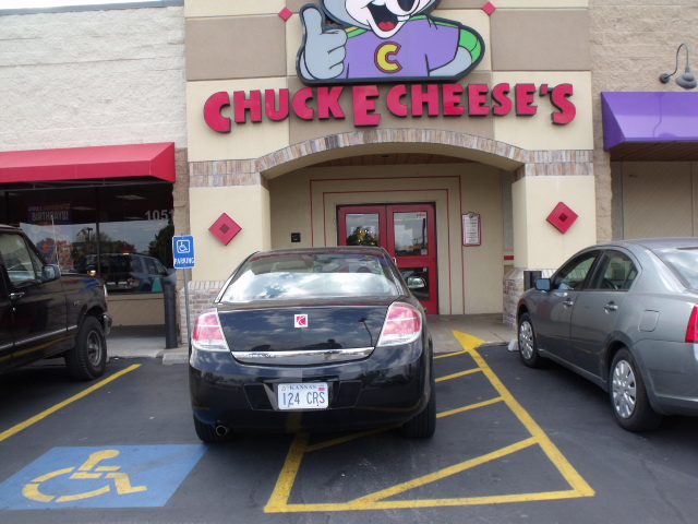 Ocupa la mitad del lugar para discapacitados y la mitad de la zona peatonal, se traduce en que el conductor es un invalido mentalmente.