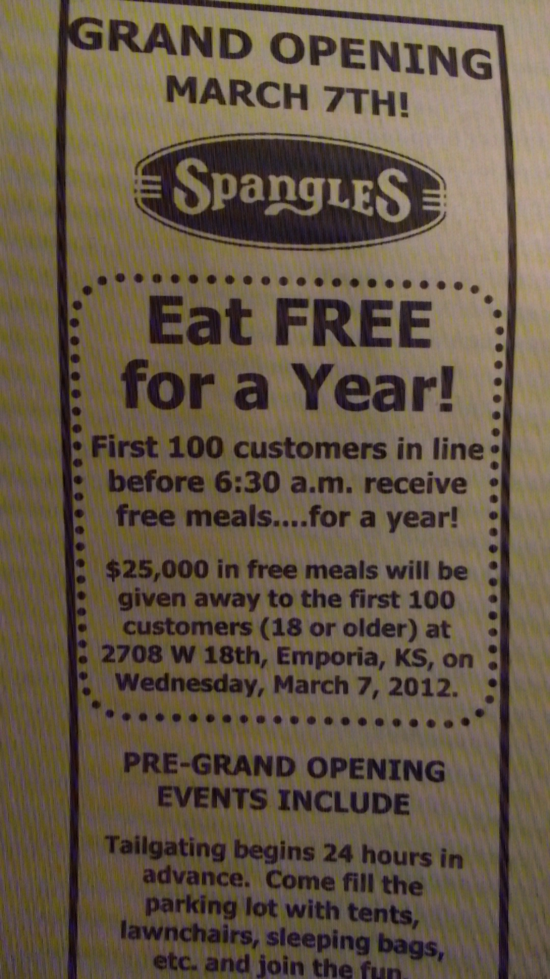 Analicemos la promocion, dice: «Come gratis por 1 año» y que se los daran a los primeros 100 clientes que esten alineados antes de las 6:30 am el dia de la apertura, lo cual suena bastante bien, pero justo abajo dice que tienen $25,000 en comida que seran dados a los primeros 100 clientes. Haciendo cuentas, vemos que diviendo $25,000/100 les toca de solo $250 por persona, y todos sabemos que con esa cantidad es imposible, aqui, en Mexico y hasta en China comer por un año. Sin duda, esta es una promocion muy engañosa, me da pena por los pobres 100 individuos poco ingenuos que podrian pasar mas de 24 horas soportando los elementos solo para recibir $250 en comida.