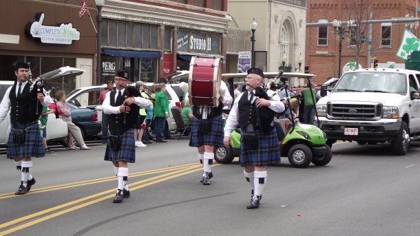 Y no podian faltar las gaitas y hombres con faldas escocesas en una celebracion irlandesa de un santo nacido en Inglaterra: