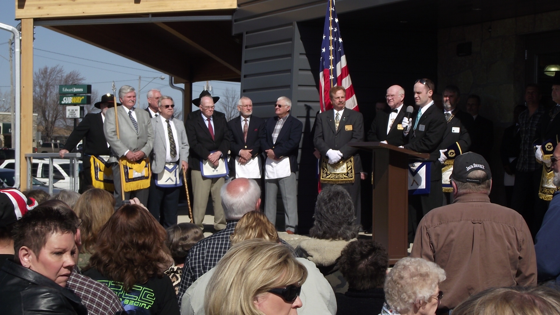 A las 11:30 am inicio una de las ceremonias mas absurdas que he presenciado en mi vida, varios individuos supuestamente vestidos muy elegantemente pero con una especie de mandil-taparrabo hicieron infinidad de ritos incoherentes con la finalidad de dedicar y consagrar el lugar. Estos señores pertenecen a la logia masonica de Kansas, y no es por ser aguafiestas, pero con ese ritual no creo que el inmueble este salvado de los elementos y fenomenos meteorologicos que caracterizan estas tierras.