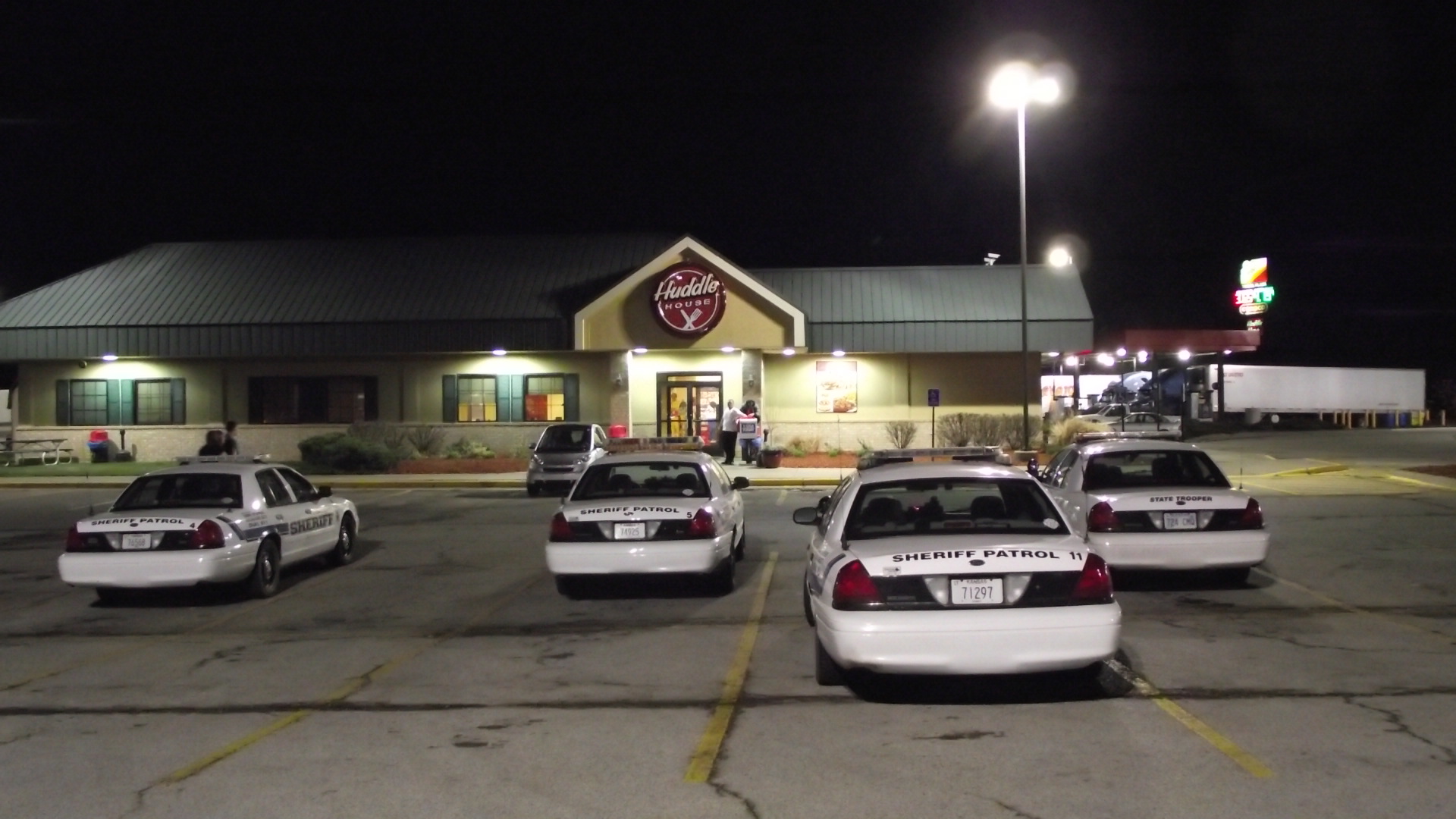 Cabe señalar que el llamado «Huddle House» esta afuera de la ciudad, y las patrullas Impala son citadinas, desconozco, pero dudo que los policias las puedan sacar del limite de la ciudad por cualquier motivo. Solo espero que no haya habido emergencias en todo el tiempo en que estos servidores publicos disfrutaban de un largo y relajado desayuno nocturno. Despues me arrepenti de no haber elegido la carrera de policia, aparentemente puedes agarrar descansos prolongados acompañado de tus compañeros de trabajo, eso es servir y proteger.