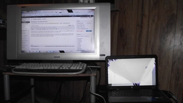No me quejo, como recordaran hace poco la habia estrenado, y precisamente por momentos como ese habia adquirido la proteccion contra accidentes. Ademas gracias a eso, ahora tengo una «nueva» computadora de escritorio con pantalla de alta definicion de 26 pulgadas (realmente solo conecte la laptop a una TV y le puse un teclado que compre en una venta de garage), se las presento: