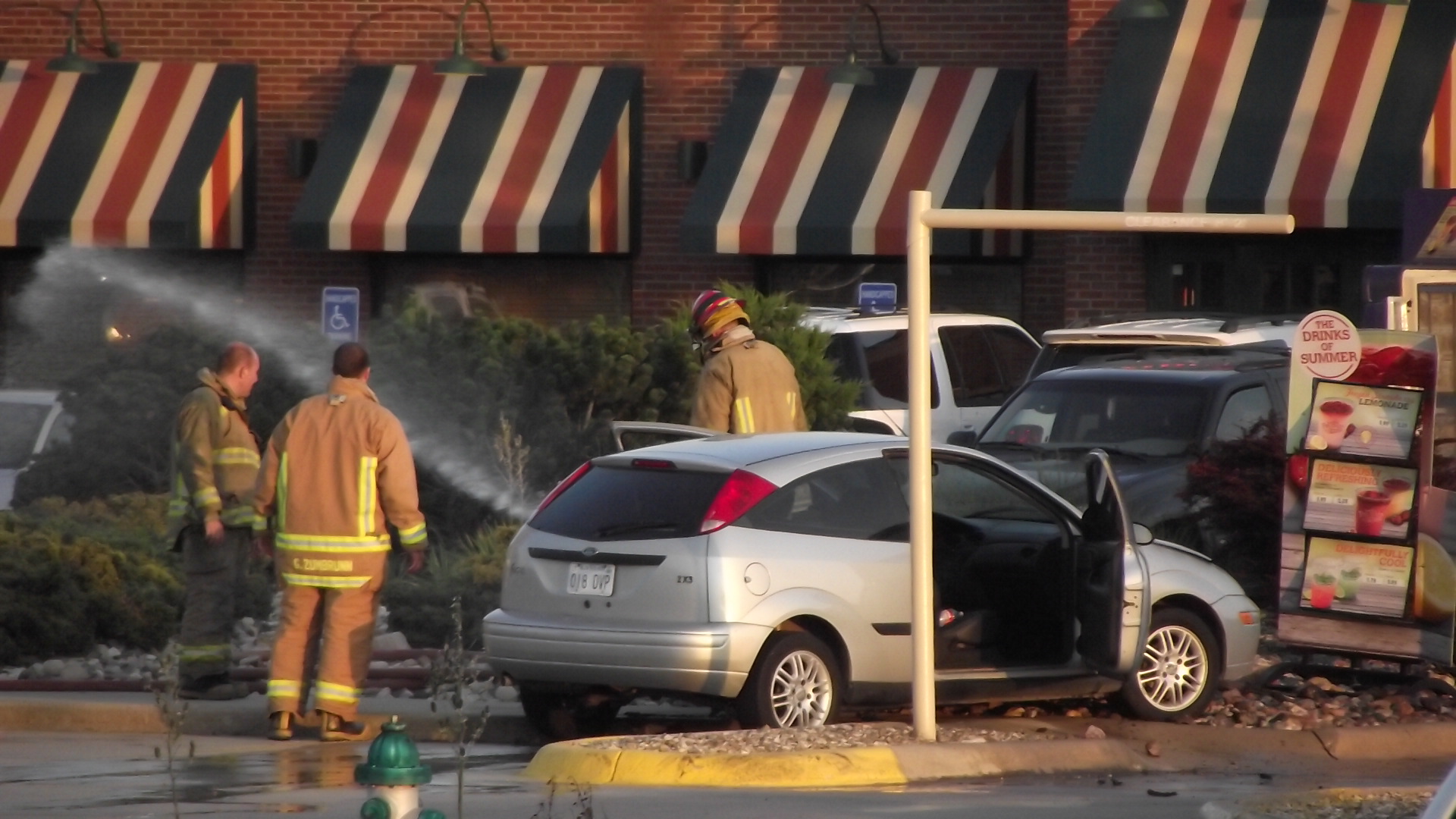 La pronta accion de los bomberos evito una desgracia mayor pues al Focus se le ocurrio prenderse en llamas en la zona restaurantera mas concurrida, la cual esta enfrente de una gran gasolinera.