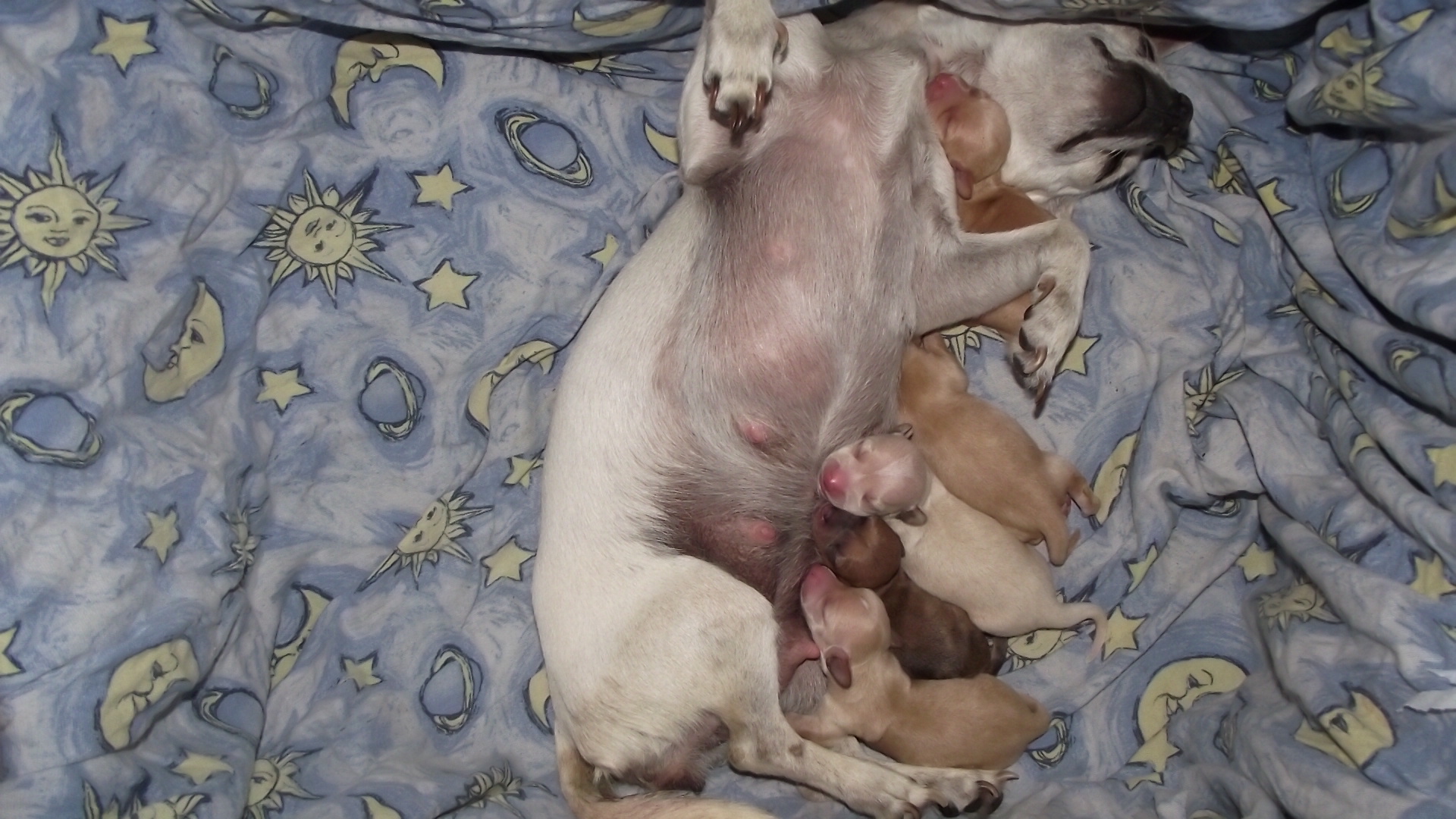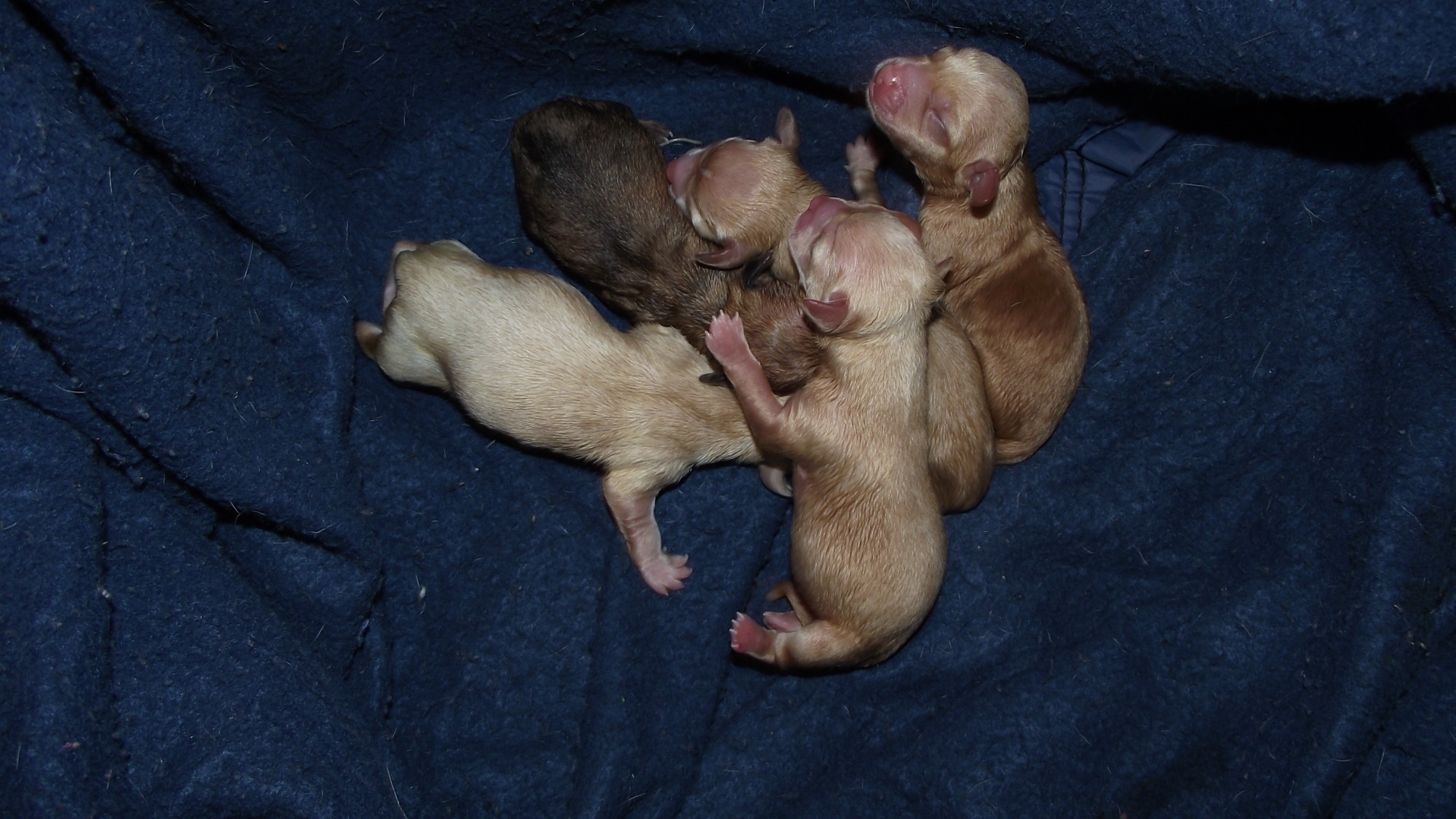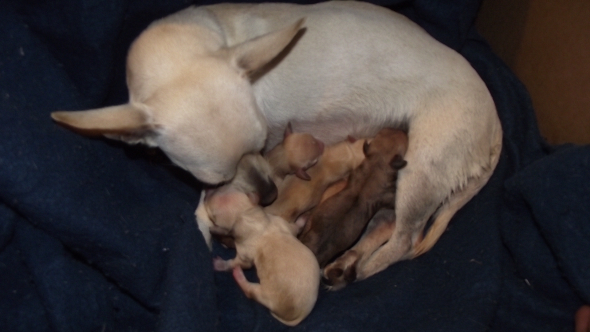 Actualizacion 2: a las 2 de la tarde nacio el quinto y ultimo cachorro, ahora la familia consiste de 7 humanos y 8 perros, es realmente insolito que en cuestion de horas los humanos fuimos superados por los miembros caninos.