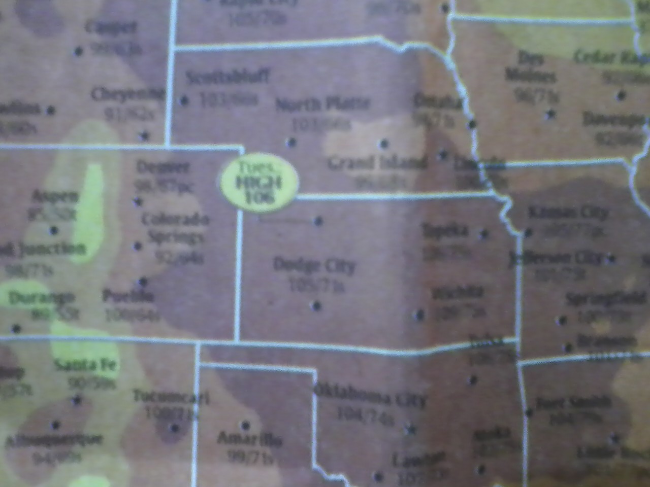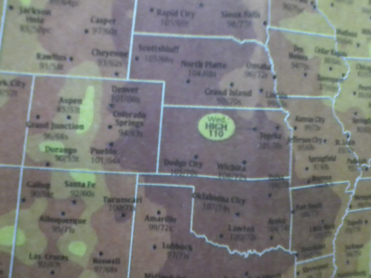 Resulta que el martes y miercoles, es decir, el 18 y 19 de julio, la mayor temperatura registrada en los 50 estados de la Union Americana no fue ni el el llamado Valle de la Muerte, ni en Texas, ni Arizona, ni Nuevo Mexico, fue orgullosamente en Kansas, el martes 41.1 grados centigrados en Hill City y el miercoles 43.3 en Abilene, les dejo unas pesimas fotos tomadas con el celular que atestiguan los records: