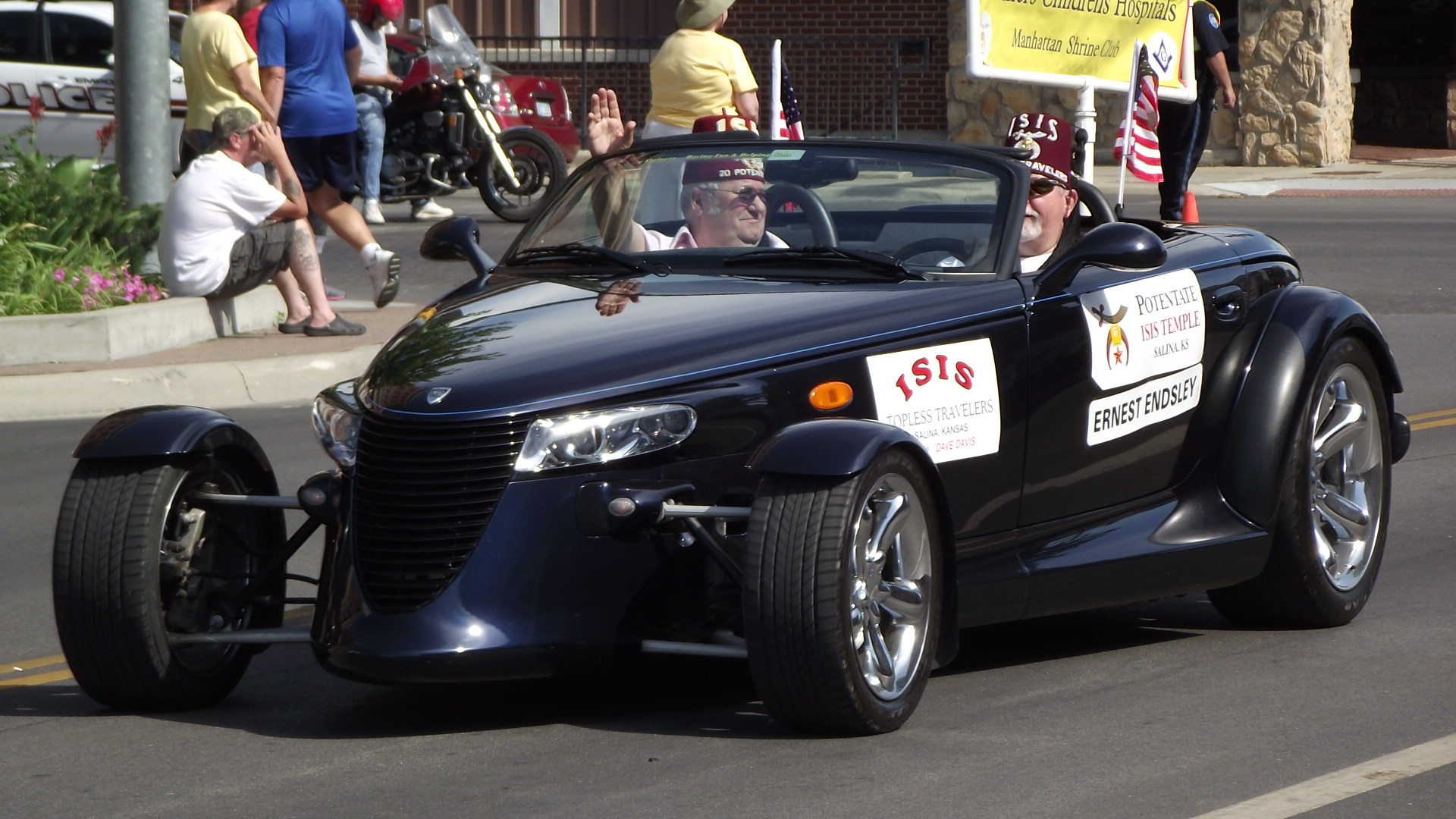 - Plymouth o Chrysler Prowler, siempre llamativo, llama la atencion la ausencia de defensa delantera, me imagino es una modificacion hecha por el dueño, debido a que no se que año es el auto desconozco si es Plymouth o Chrysler, aunque en realidad es la misma cosa.