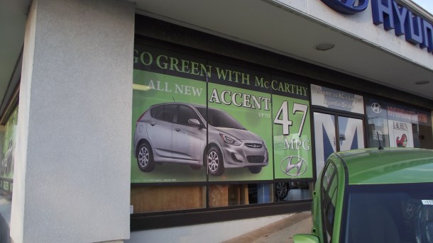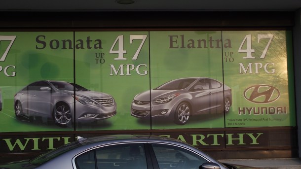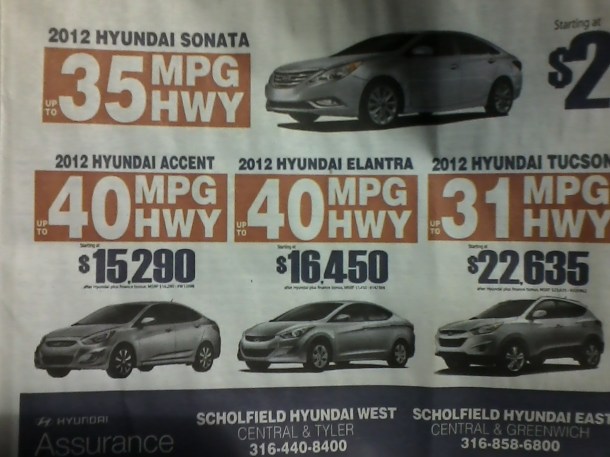 Segun la agencia McCarthy Hyundai, 4 modelos: Accent, Sonata, Elantra y Tucson pueden alcanzar hasta 47 MPG, la logica nos dice que es imposible que 4 autos con distintos moteres y carrocerias logren el mismo numero, con un poco de investigacion, visitando la pagina oficial de Hyundai, o viendo el letrero de una agencia honesta nos damos cuenta de la tecnica de este concesionario: