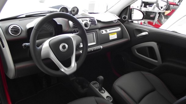 El Smart Sharpred tiene equipo de serie que en los demas Fortwos es equipo opcional, por ejemplo tenemos asientos de piel calefactados, sistema multimedia con 5 bocinas y navegacion incluida. En el interior tambien vemos que el tablero esta forrado en piel y junto con los asientos tiene costuras dobles en rojo.