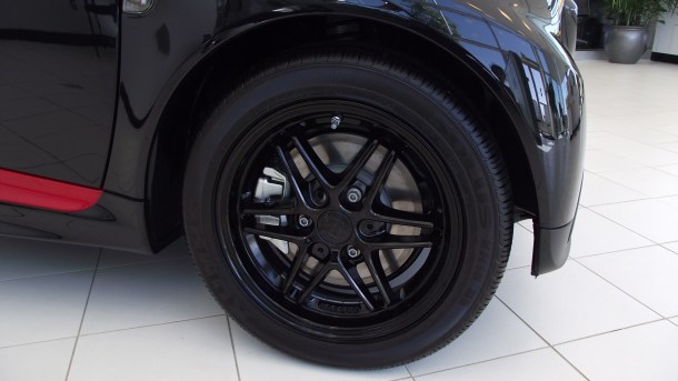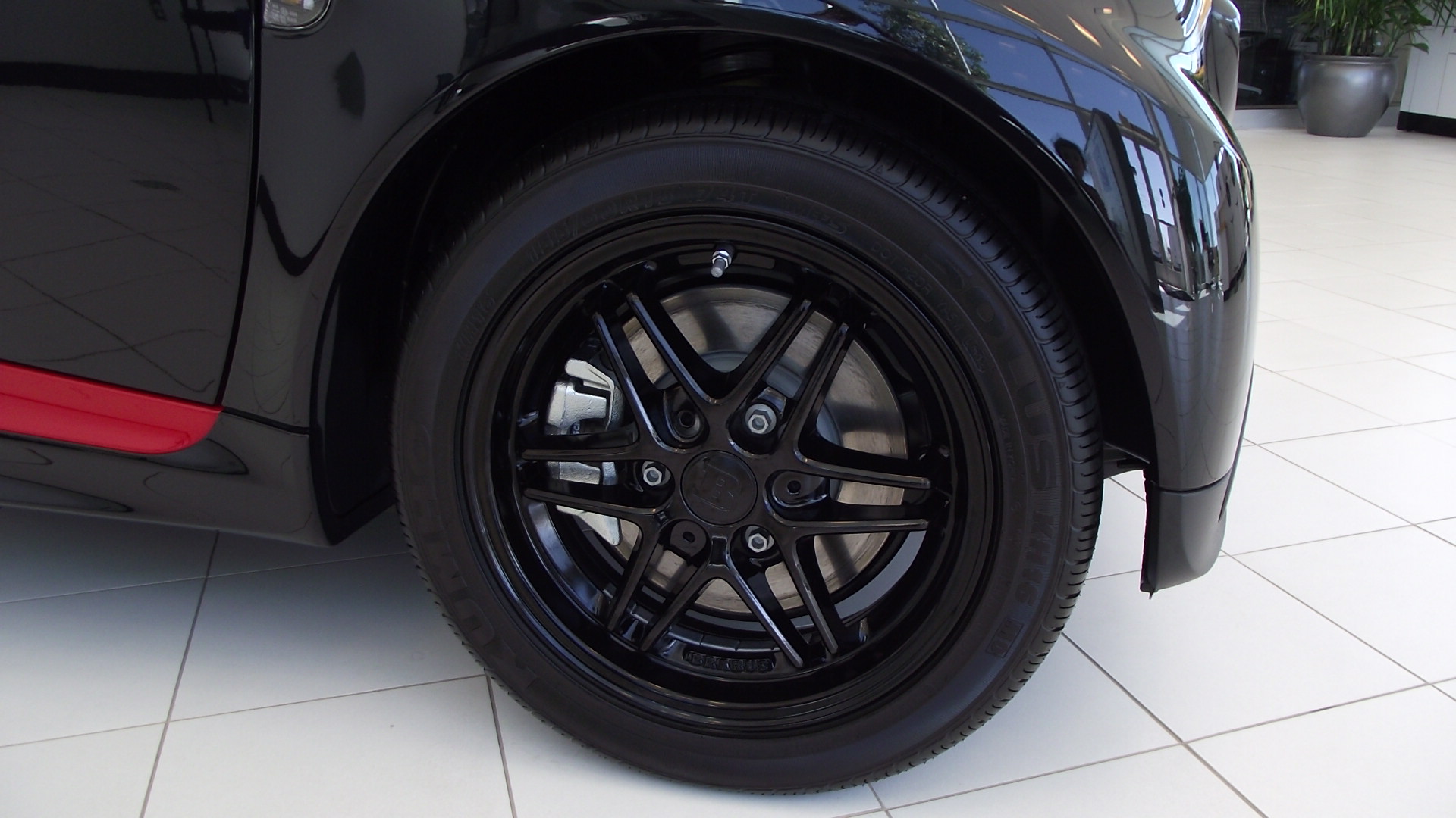 Faldoncitos de paragolpes del cabrio negro que vienen pintados (el trasero con un vivo anodizado), insignia Smart de parrilla ploteada del mismo rojo que la celula de seguridad, polarizado negro intermedio en vidrios salvo parabrisas y alguna otra cosita menor.