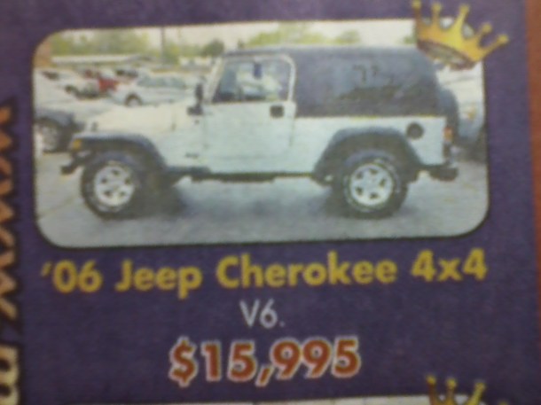 Y que les parece este Jeep Cherokee 2006? En realidad el de la foto es un Wrangler, el Cherokee dejo de comercializarse en el 2001 en este pais.