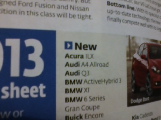 Los siguientes 2 ejemplos los vi en la revista Consumer Reports, la cual se la pasa criticando de todo, ahora me toca a mi criticarlos por su ineptitud, primero dicen que los modelos nuevos para el 2013 en este pais incluyen el Audi A4 Allroad, cuando en realidad aqui solo se llama Audi Allroad y la camioneta esta basada en el A6 Avant, no el A4: