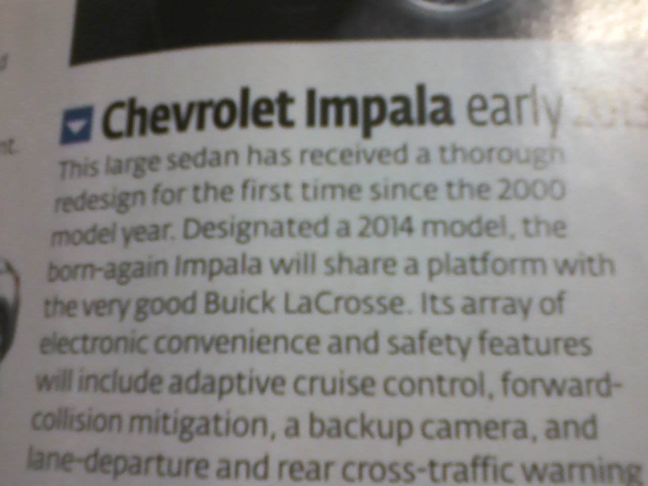 Despues, los mismo expertos de CR como se les conoce, dicen que el Chevrolet Impala 2014 ha recibido el primer rediseño desde el año 2000, parece que estas personas no se dieron cuenta que en el 2005 salio la novena generacion la cual era completamente distinta a la octava, es decir el modelo 2000-2004: