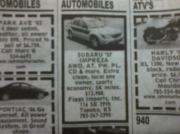 El siguiente ejemplo es menos garrafal, ya que por lo menos muestra un auto relacionado con el que pretenden mostrar, anuncian la venta de un Subaru Impreza pero con la foto de una Baja: