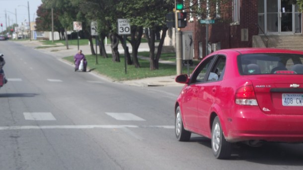 Vemos a una señora en su silla de ruedas viniendo en sentido contrario, el Aveo tuvo que frenar a pesar de que como se puede apreciar tenia el siga, y esperar a que pasaran los autos del otro carril para poder continuar con su camino, el colmo es que no utilice la banqueta que esta a pocos metros de la calle. Eso es ser invalido e inseguro.