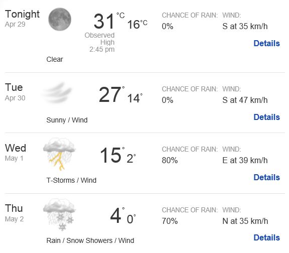 Como ven, ayer tuvimos un clima acorde a la temporada, y el jueves, ya en pleno Mayo tendremos una temperatura maxima de solo 4° Centigrados, eso es una diferencia de 27°, por si fuera poco hay posibilidades de nieve, es decir, volvemos al invierno. Asi o mas loco el clima? Me pregunto si todo esto es por aquello del calentamiento global.